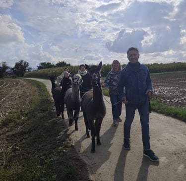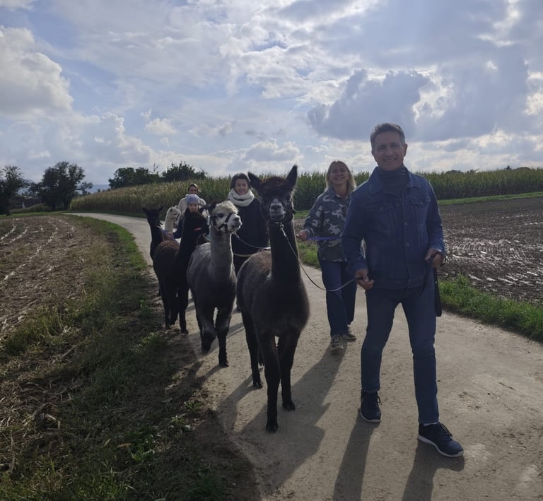 Die Alpakas führen uns dabei ganz natürlich in die Ruhe- Schritt für Schritt, ohne ein Wort, aber mit einer Gelassenheit die ansteckt. Jede Wanderung ist anders, jedes Tier hat seinen eigenen Charaktder, und genau das macht jede Begegnung besonders.